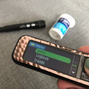 Here’s where the 640g pump from Medtronic, 630g in the US, really starts to shine. The meter that comes with the pump is integrated to send a remote bolus!